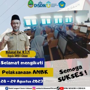 Alhamdulillah Pelaksanaan Asesmen Nasional Berbasis Komputer (ANBK) di SMKN 1 Cidaun telah berjalan dengan lancar. Pelaksanaan ANBK ini dilaksanakan selama 2 hari yang dimulai dari hari Senin, 28 Agustus 2023 sampai dengan hari Selasa, 29 Agustus 2023. ANBK tersebut dilaksanakan sebanyak 3 sesi, yakni sesi 1 pada jam 07.30 – 09.40 WIB, sesi 2 pada jam 10.40 – 12.50 WIB, dan sesi 3 jam 14.20 – 16.30 WIB. Para peserta yang mengikuti ANBK berjumlah 45 orang peserta didik. Para peserta ANBK tersebut merupakan peserta didik yang berasal dari kelas XI yang terpilih secara acak oleh Pemerintah. Pelaksanaan ANBK dilakukan secara full online dengan menggunakan 1 ruangan yaitu ruangan Laboratorium Komputer.